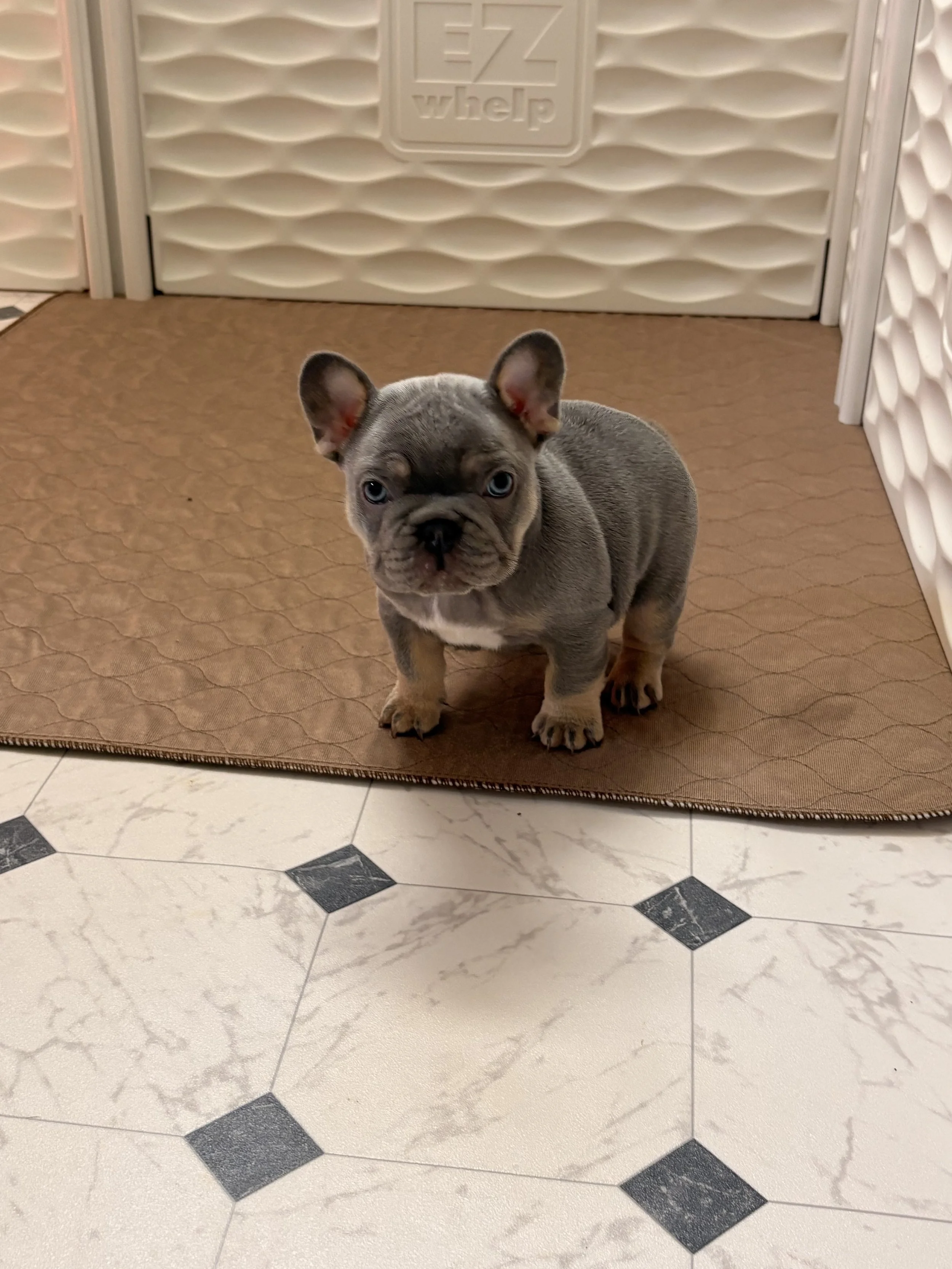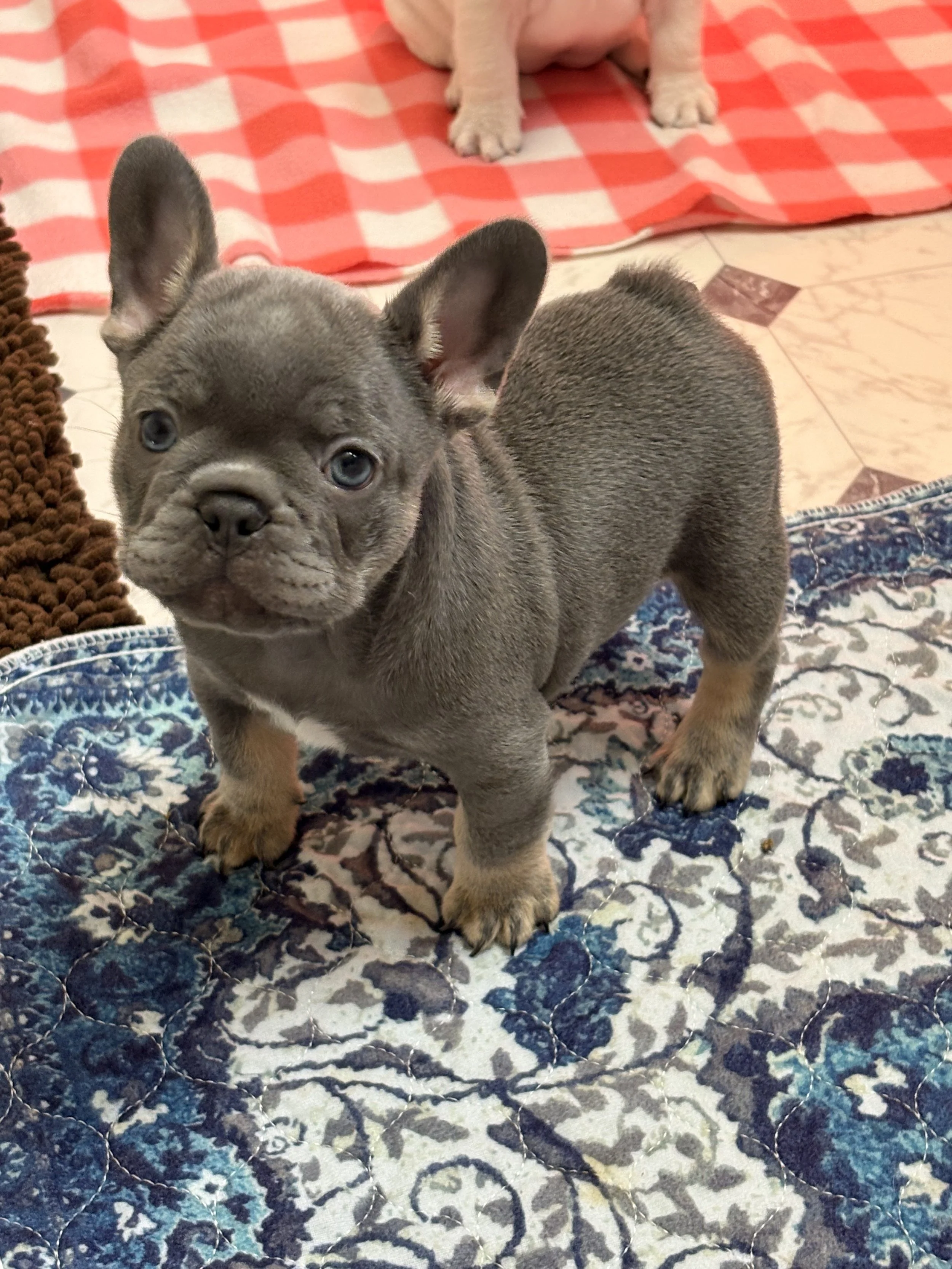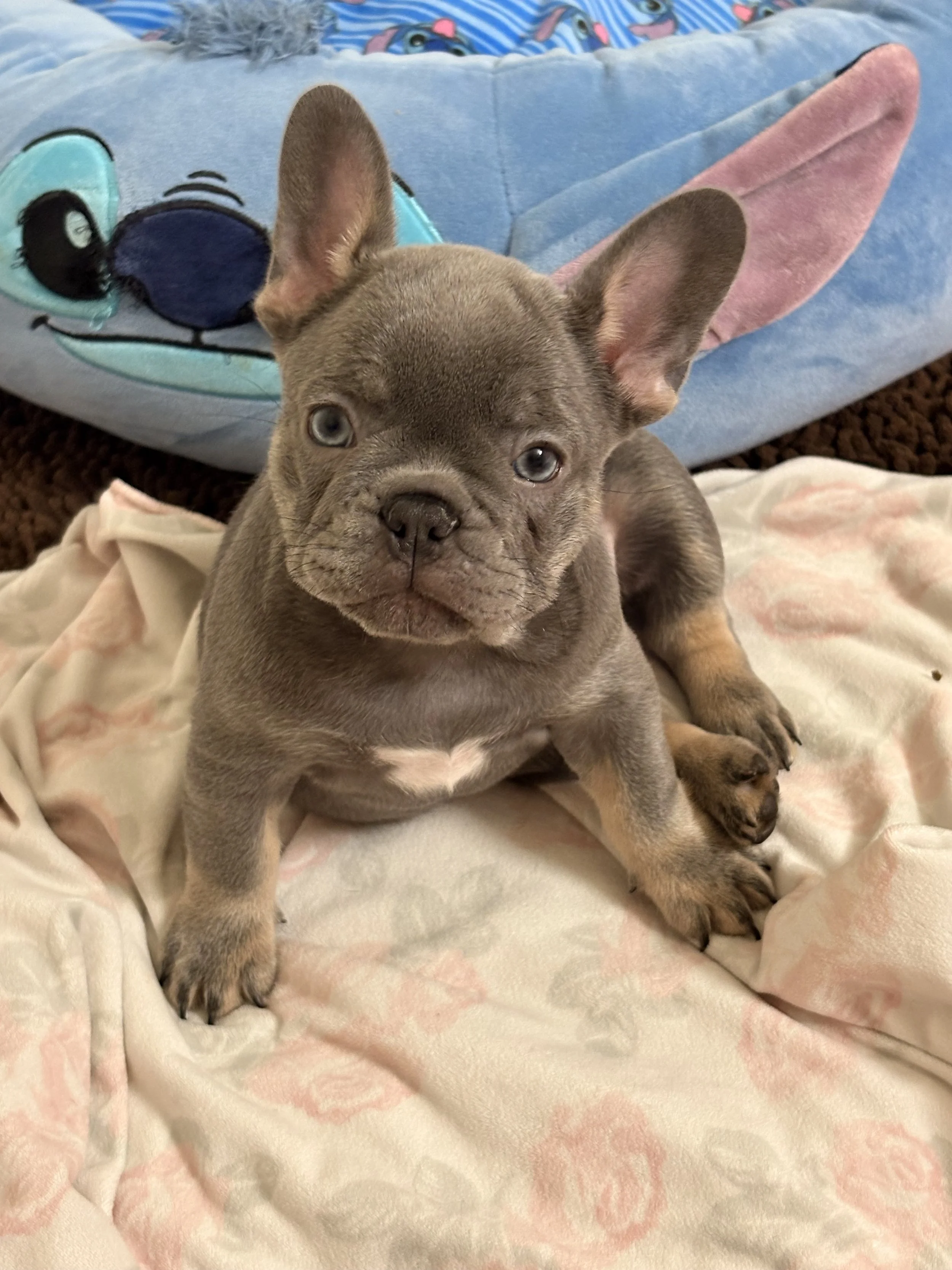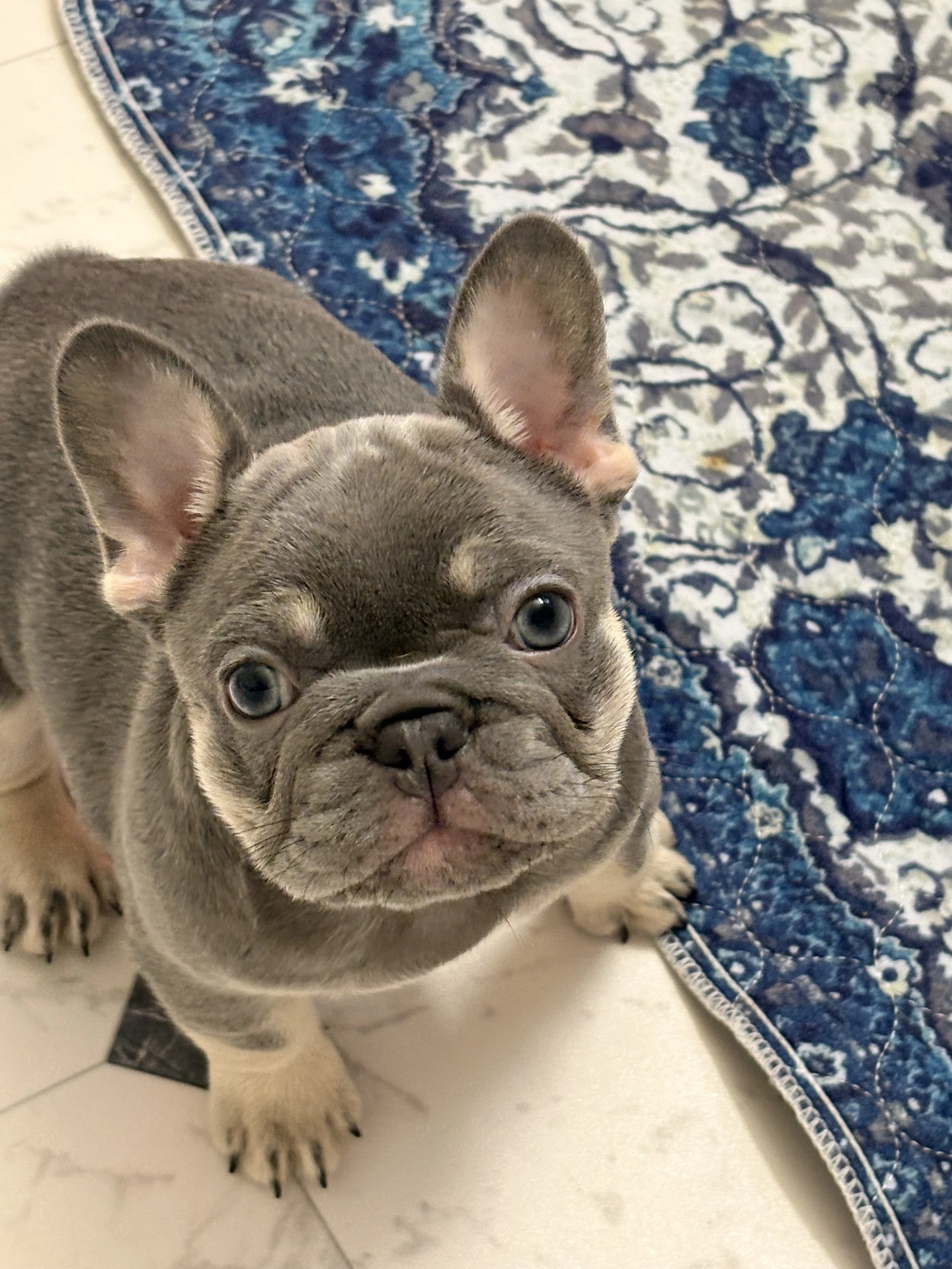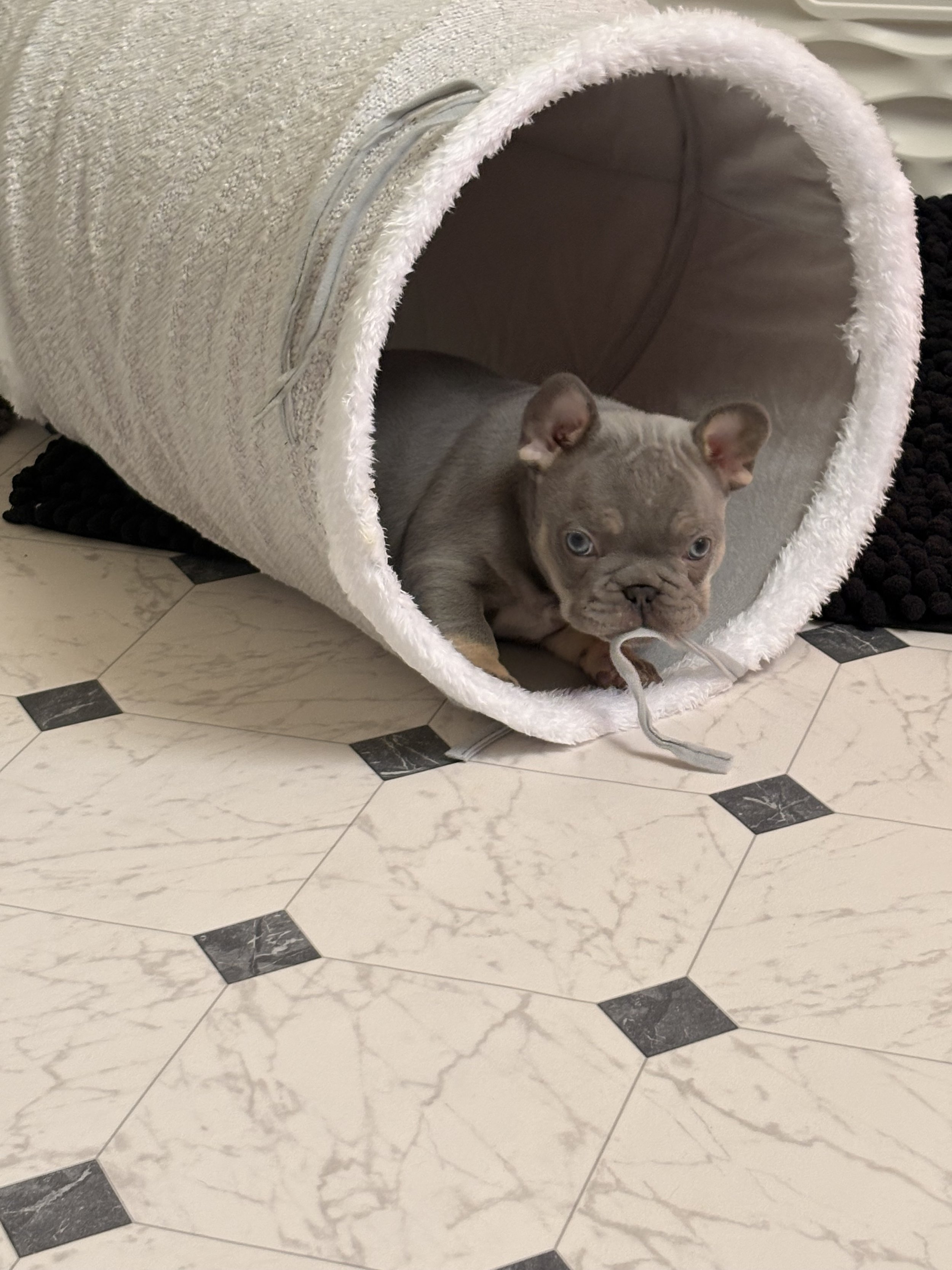 Frankenstein is a charming lilac and tan male with an impressive large head, short legs, and a stunning silky deep lilac coat. He’s set to be a robust and attractive French bulldog! His personality is very sweet and loving. He enjoys hanging out in my lap and giving kisses.